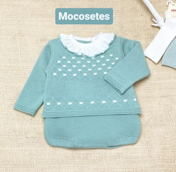 Conjunto bebé verde agua de dos piezas con jersey de lana con cuello y braguita.