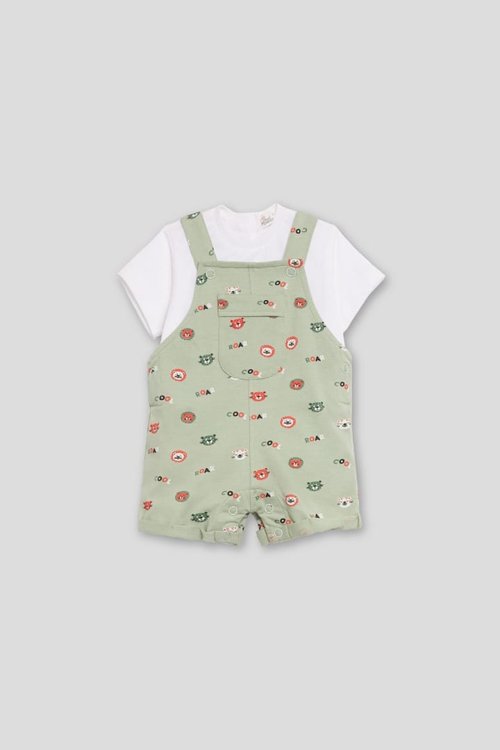 Conjunto de 2 piezas de algodón de la marca Streek Monkey con camiseta en manga corta de color blanco estampada y peto con estampado de tigres. Ref. 252004