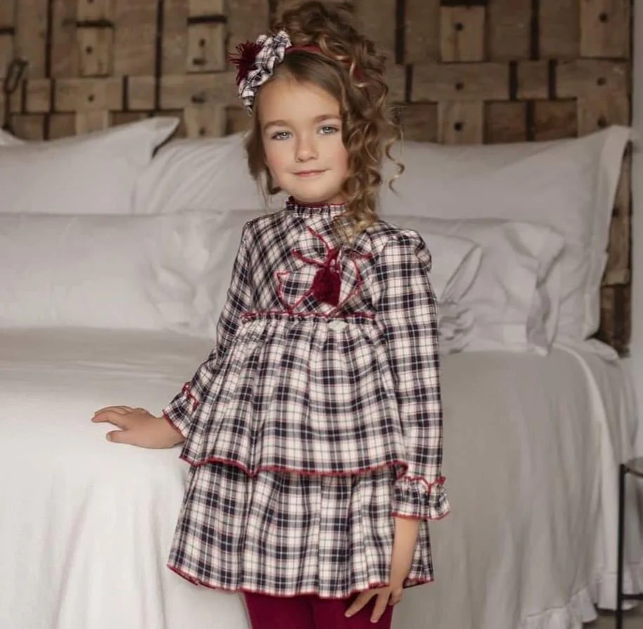 Precioso vestido para niña de manga larga de la marca Miranda. Esta confeccionado en tejido de cuadros de trama azul marino sobre fondo blanco con ribetes de hilo rojo. Es de corte trapecio con la falda dividida en 2 volantes. Tambien lleva volantes en los puños y el cuello, todos ellos ribeteados con hilo rojo. Luce gran lazada de la misma tela con detalles rojos en el delantero. Cierra en la espalda.